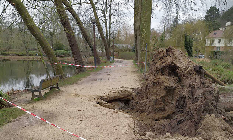 Une exsurgence pourrait être à l'origine de la chute de ce beau platane tombé entre le Lac du Mail, à Orsay, et l'Yvette.